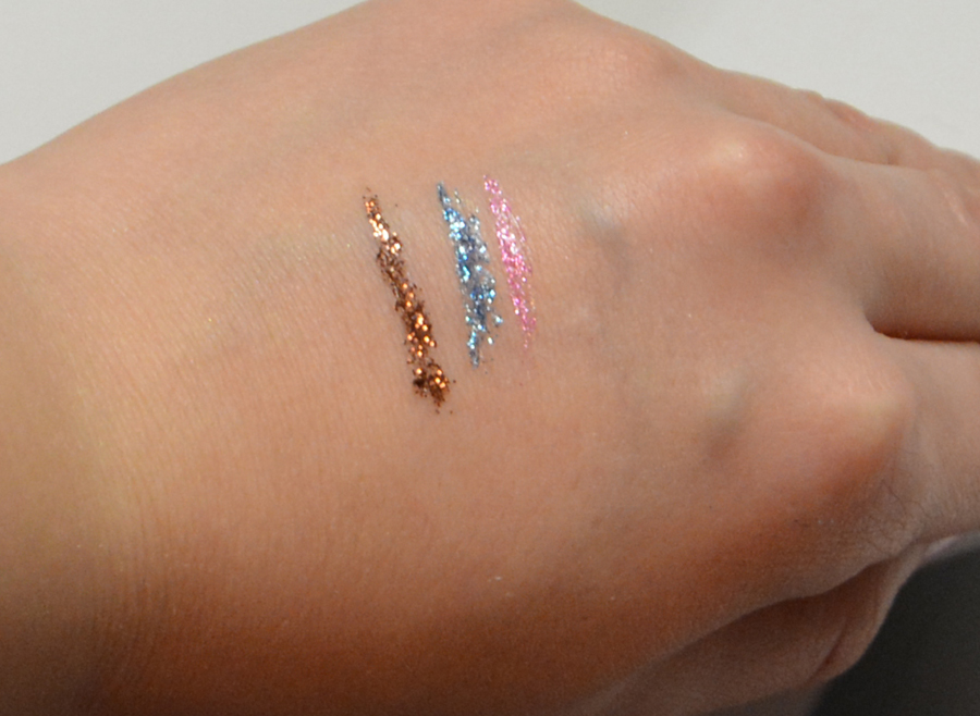 Iberon korut (-50%), Lumenen kynsilakan (4€), Miss Cop glitter linerit (á 4,40€) ja ripsivärin(Normaalihintainen) ostin Carlsonilta. Glitter lineria en olisi edes ostanut, mutta kun kokeilin sitä käteeni ja sitten pyyhin paperilla pois, niin sehän ei muuten lähtenyt. Pakkohan ne oli sitten ottaa mukaan, jos kerran noin kestäviä ovat. Omalla vastuulla tosin, koska nämä sisältää akrylaatteja, joten saa nähdä pystyykö käyttämään, mutta perustelin(Uskottelin) itselleni tätä sillä, että ei tule ainakaan päivittäin käytettyä. Tässä glitterit kämmenessä. Viereen laitoin vertailun vuoksu Make-Up Storen Glitter Liner Choco Luxia(joka alkaa olla jo vähän kuivahtanut).