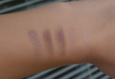 Värit ovat siis ihania kimaltelevia, mutta tuo tummemmat olikin mattaisempia kuin kuvittelin, tai ne on oikeastaan enemmän sellaiset vähän helmiäiset. Tässäpä kuvaa väreistä iholla:
