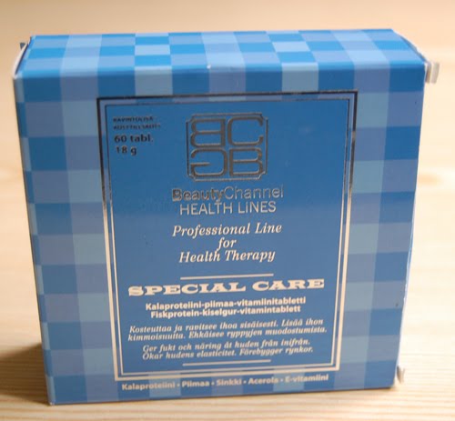 Tuote on ravintolisä, joka sisältää: Kalaproteiinia, piimaata, sinkkiä acerolaa ja e-vitamiinia. Pakkauksessa luvataan: auttavat ihon kosteustasapainon ylläpidossa, vahvistavat ihon rakennetta ja ehkäisevät vanhentavia hapetusreaktioita. Kahdesta tabletista saa mm. koko päivän E-vitamiini annoksen.