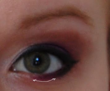 Ota sen jälkeen rajauspensseliin samaa violettia, jota käytit yläluomelle ja tee sillä rajaus alaluomelle lähelle silmää. Älä tee rajausta kuitenkaan ihan silmät sisänurkkaan asti.