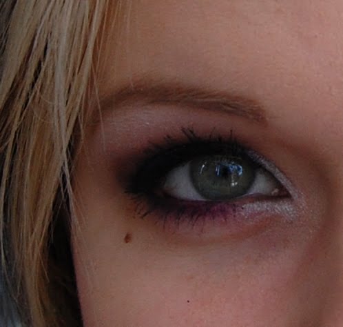 Ensiksi laita luomien sisänurkkiin ja luomelle valkoista luomiväriä. Itse käytin Nivean Creative eyes luomiväriä, väri on metallinhohtoinen valkoinen. Metallinhohto lisää bilemeikin efektiä. Halutessasi voit lisätä silmien yläripsien alapuolelle rajauksen kajalilla.