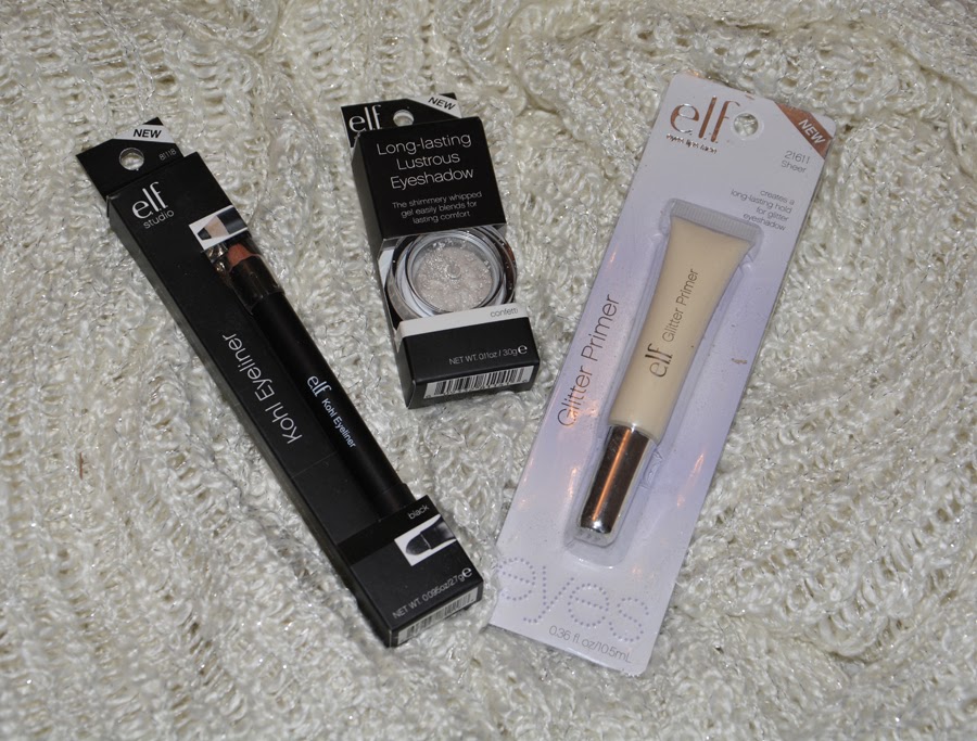 Lisäksi ostin mustan kajal kynän (Näitä ei voi koskaan olla liikaa), pitkäkestoisen valkoisen metallinhohtoisen luomivärin ja glitter primerin glitterluomiväreille. Näitä en ole vielä päässyt testaamaan, mutta glitter primerille minulla on aika kovat odotukset! Kuvasta jäi näköjään uupumaan vielä mattapäällyslakka kynsille. Sillä voi siis muuttaa normikynsilakan mattapintaiseksi. En malta odottaan, että pääsen testaamaan.