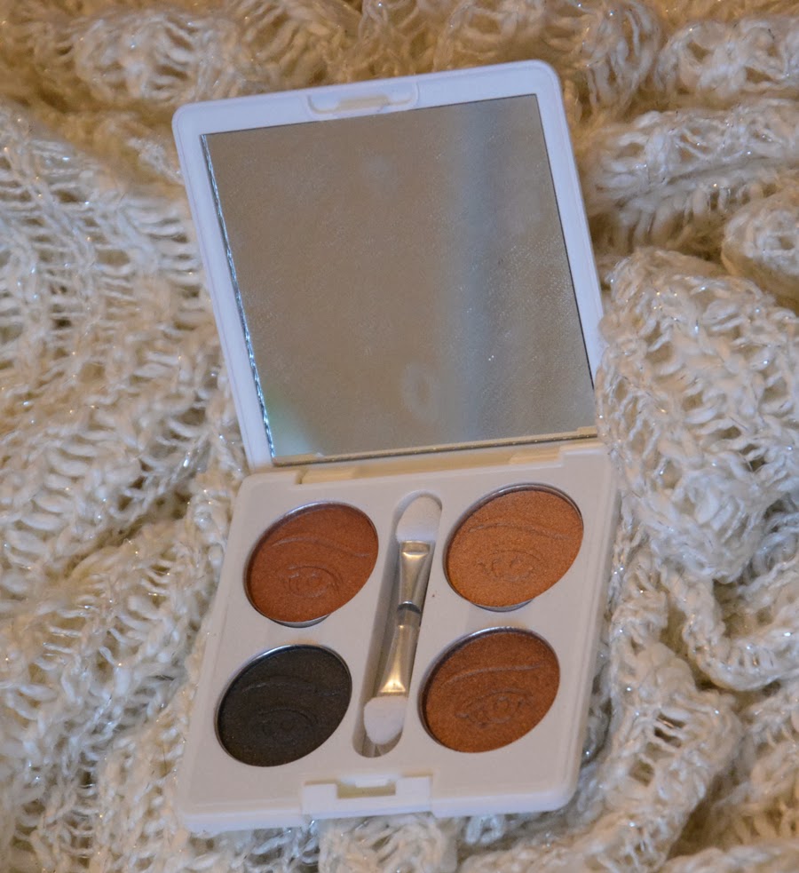 Kiinnostuin kovasti tästä paletista, johon sai itse valita luomivärien sävyt. Valitsin siis perusruskeita, sillä minulla ei ollut elfin meikeistä aikaisempaa kokemusta ja ajattelin että ruskeilla saa kivoja neutraaleja meikkejä tehtyä. Luomivärien sävyt: Driftwood, Wheat, Dusk ja Mocha. Luomiväreissä on hieman hohtoa, eli eivät ole mattavärejä.