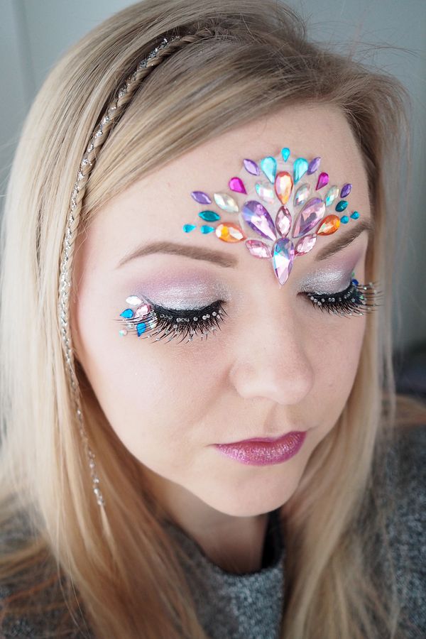 Essence Face Jewel -ihotimantteja tuli kahdet erilaiset, joista saa tehtyä vaikka minkälaisia meikkiyhdistelmiä. Timanteissa on itsessään liima ja ne ohjeistetaan laittamaan meikittömälle iholle. Itse kuitenkin päätin liimata timantit valmiin meikin päälle ja vaikka tämä voikin heikentää timanttien pysyvyyttä, niin mulla ne kyllä pysyi todella hyvin myös meikatulla iholla. Samalla välttää ihon kirjavuuden, jos meikkivoide ei olekaan ihan samansävyinen oman ihon kanssa. Kokeilin paria eri lookia, kunnes räväytin sitten molemmat timanttiliuskat kasvoille. More is more!