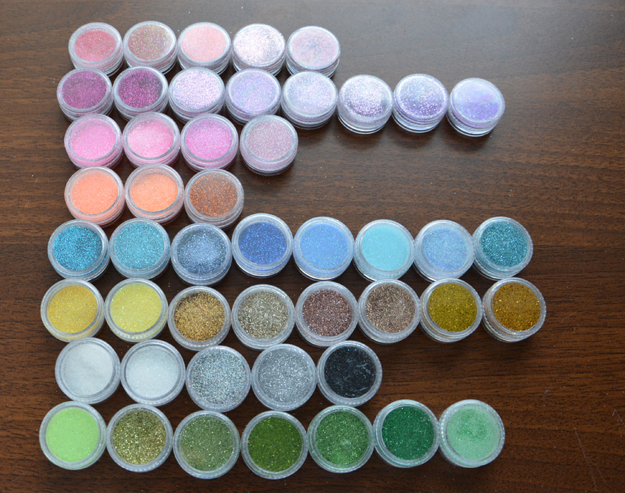 Glitterit paketeista otettuna. Yritin jaotella niitä hieman sävyjen mukaan. Kahden ylimmän rivin, eli punaisten ja violettejen sävyt ei oikein tässä näy kunnolla, kun heijastui sen verran tuota valoa.