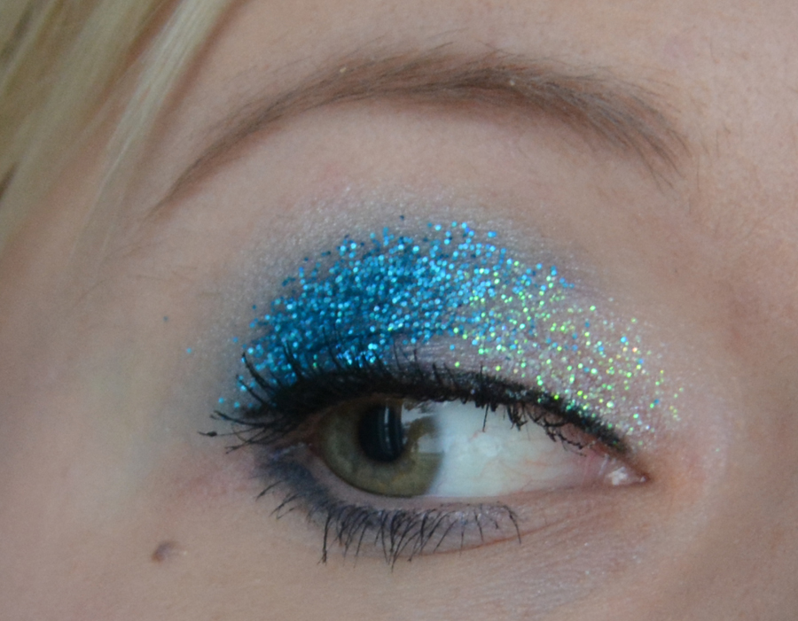 Piti tottakai heti päästä testaamaan näitä silmäluomilla, joten valitsin nämä kaksi sävyä käytettäväksi. Pohjalle laitoin Sleekin paletista valkoista ja sinistä ja siihen päälle Elfin glitter primeria ja tietysti näitä glittereitä. Kyllä nämä aika kovasti karisi laiton yhteydessä, mutta sai helposti kyllä myös putsattua silmien alta.