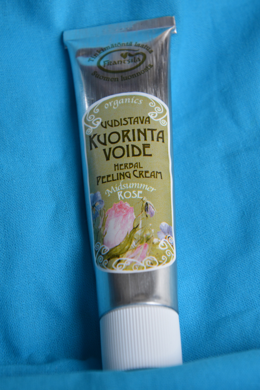 Frantsilan kuorintavoiteessa on hauska metallinvärinen tuubi ja tätä tuotetta ehdinkin jo testaamaan viikonloppuna. Se vaikutti oikein pätevältä tuotteelta eikä ollut minun herkälle iholleni ollenkaan liikaa. Koostumus on melko paksua tahnaa, mutta se levittyy kivasti ja siinä on pienen pieniä rakeita, jotka kuorivat ihoa.
