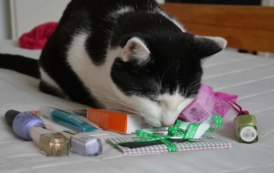 Alle vielä kuvaa, kun yritin goodiebagin sisältöä kuvata kotona. Tiedättehän miten kissataloudessa käy, kun levität goodiebag tavaroita kuvattavaksi?
