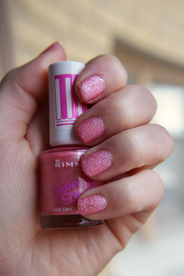 Jotkut varmaan tietääkin, että olen sokerilakkojen fani. Tykkään paljon kimaltelevista tekstuurilakoista, joten ei ole kovinkaan yllättävää että tämän kevään suosikkini on vaaleanpunainen sokerilakka. Lakka on Rimmelin Sweetie Crush sarjan lakka sävyssä 009 Candyfloss cutie. Väri onkin tuollainen purkkapinkki ja kimaltaa ihanasti.