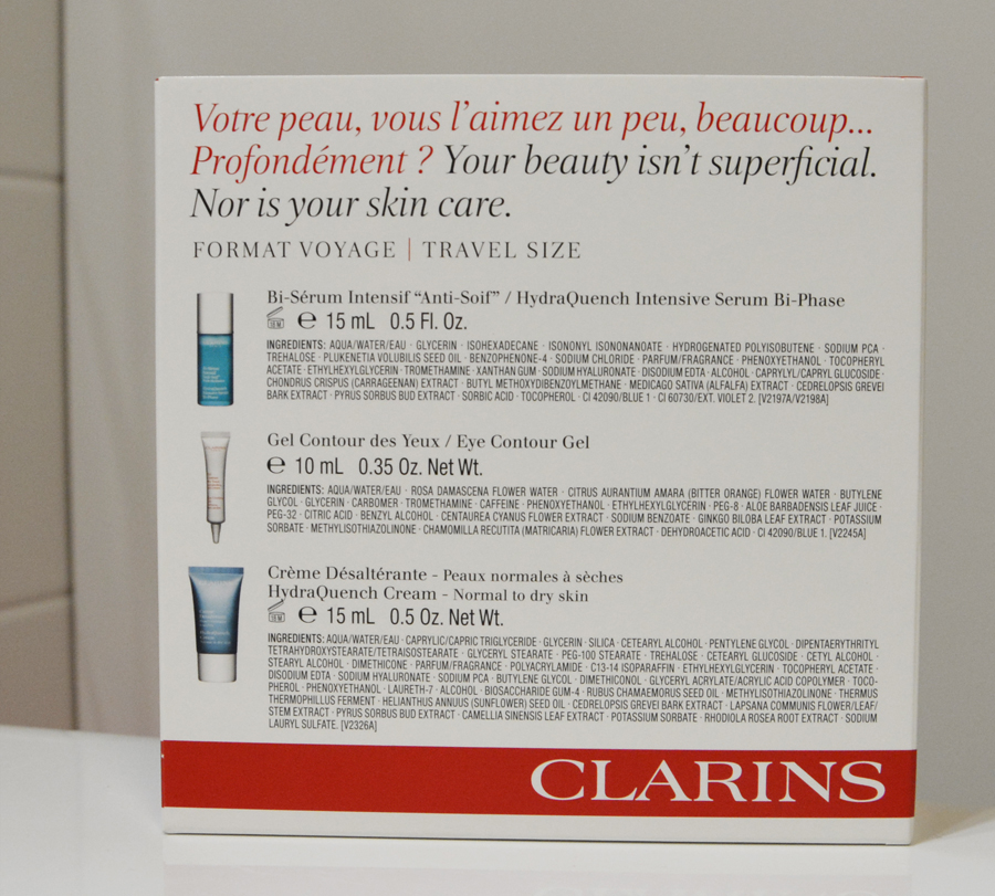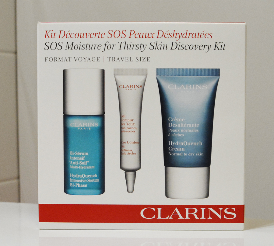 Jep, mun iho on taas siinä kuosissa, että se hilseilee ja samaan aikaan työntää finnejä ja mustapäitä. Kovia pakkasia on viimein luvassa, joten se ei ainakaan tule auttamaan asiaa. Niinpä päätin suunnata Joensuun sokokselle etsimään jotain hyvää seerumia, jolla voisin tehostaa tuon liian kevyen voiteen vaikutusta. Hetken siinä myyjän kanssa testaillessa ja ainesosaluetteloita selaillessa päädyttiin Clarinsin Hydraquench seerumiin. 30ml pullo olisi maksanut 61,90€, mutta myynnissä oli myös matkakokoisten tuotteiden pakkaus johon kuului 15ml seerumi, 10ml silmänympärysvoide sekä 15ml kosteusvoide ja tälle paketilla hintaa tuli 24,90€, joten oikein hyvä diili siis.