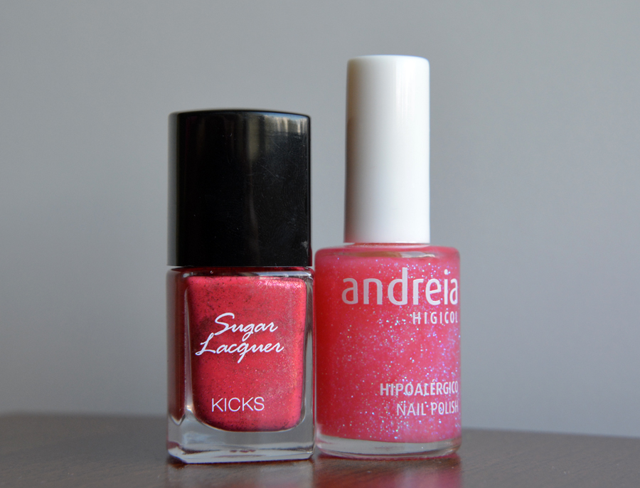 Joensuun miitistä keväällä ostamani(vai olikohan tää ilmainen) Andreia kimallelakka, sopi todella kivasti Summer Lovinin päälle. Sävynumero näyttäisi olevan 37 ja edes hiekkalakan efekti ei kokonaan peittynyt tämän alle, vaan pinta jäi edelleen vähän rosoiseksi. TYKKÄÄN!