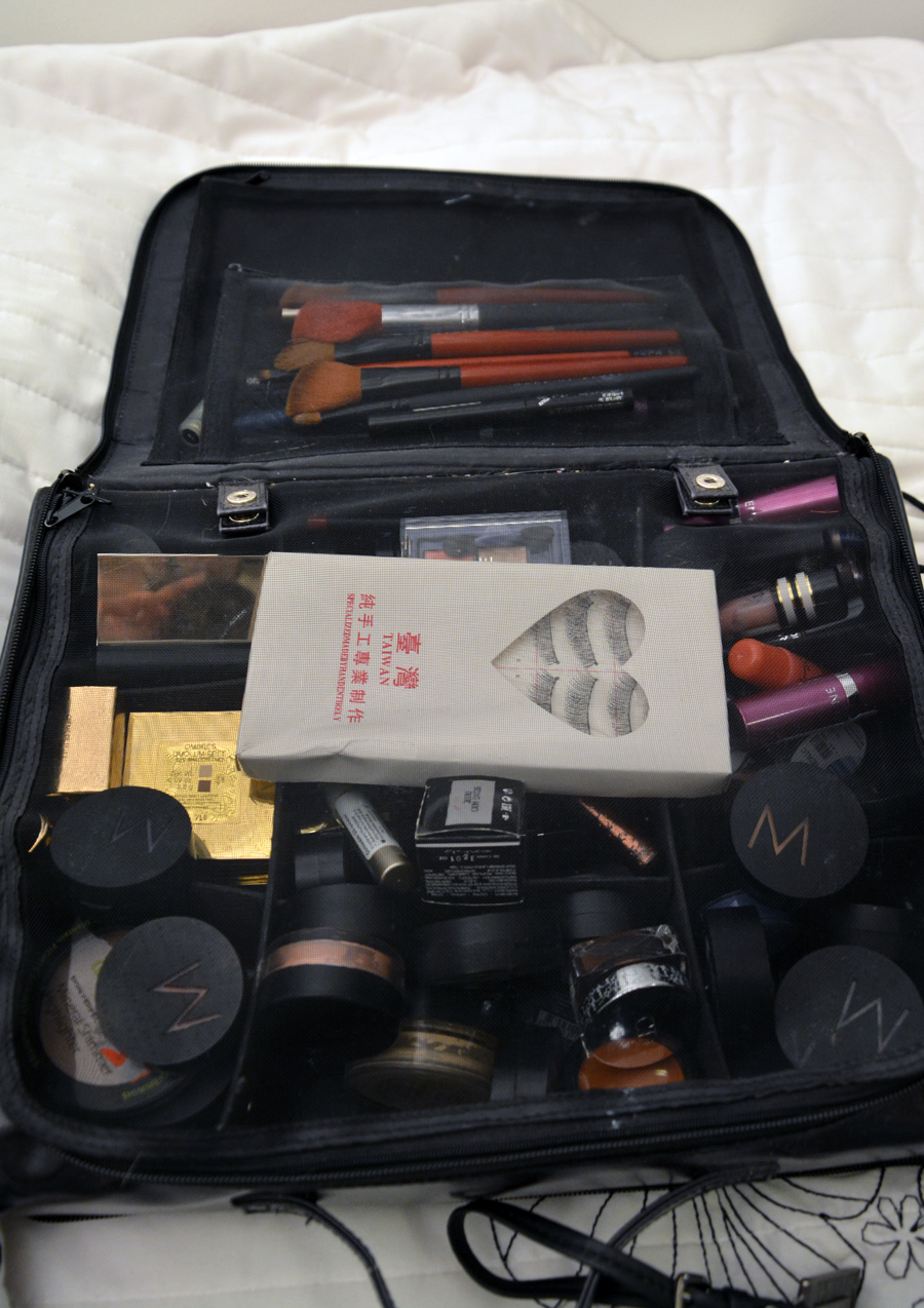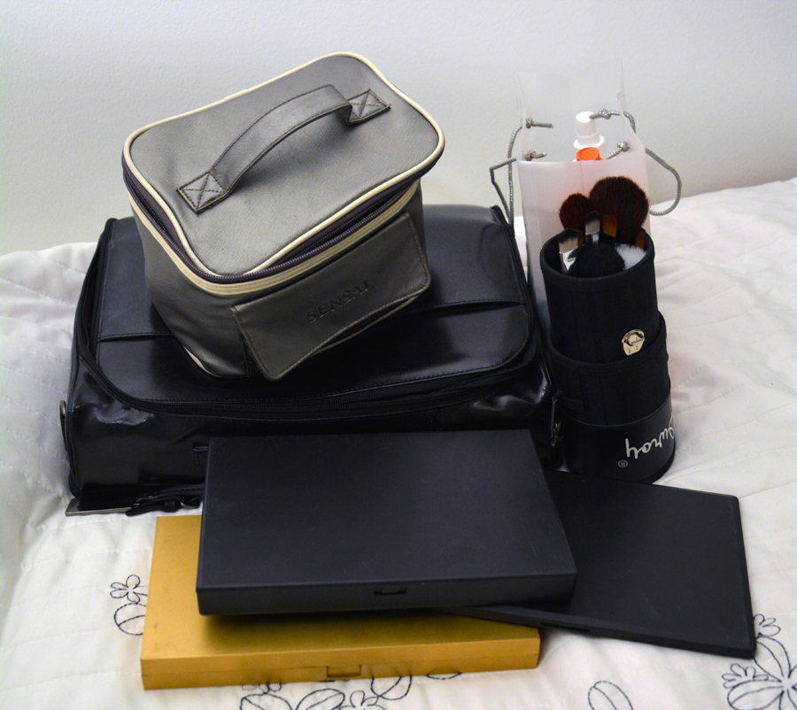 Otan yleensä mukaani myös oman meikkipussini. Tämä erottaa minut varmasti ammattimeikkaajasta, sillä käytän joitain samoja tuotteita myös muita meikatessa. Näistä esimerkkinä luomivärin pohjuste (tuubissa). Koska en tee tätä työkseni, niin en nää järkeä ostaa omaa luomivärinpohjustetta satunnaisille kerroille, pakkiin pilaantumaan. En tietenkään käytä esimerkiksi itse käyttämiäni huulipunia suoraan kenekään huulille, sillä siinä kyllä tulee jo hygienia-asiat vastaan. Voidemaiset tuotteet menee aina spaattelin kautta.