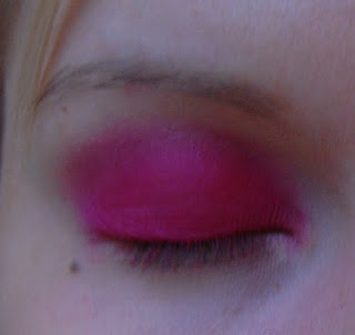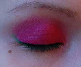 Levitä sormella voidemaista punaista luomiväriä koko luomelle ja häivytä kohti kulmakarvaa. Käytin Fräuleinin aniliininpunaista geelimäistä eyeliner/luomiväriä. Voidemaista luomiväriä on helpointa häivyttää ja levittää sormella. Siveltimillä tulee helposti liian paksu kerros.