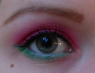 Kokeilin vielä laittaa eyelinerilla yhtä pitkän rajan kuin vihreää luomiväriäkin. Mielestäni sekin sopii tähän meikkiin, mutta on jokaisen oma päätös haluaako sitä tehdä vai ei.