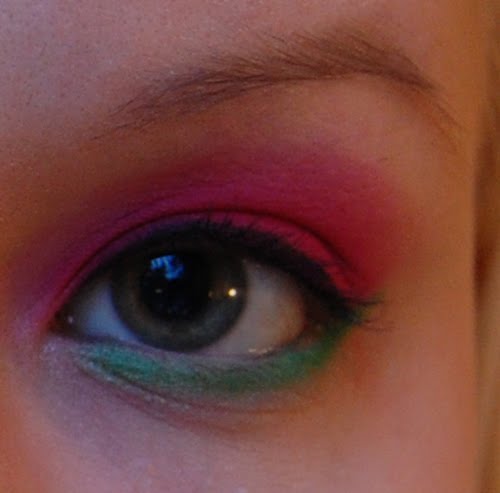 Kokeilin vielä laittaa eyelinerilla yhtä pitkän rajan kuin vihreää luomiväriäkin. Mielestäni sekin sopii tähän meikkiin, mutta on jokaisen oma päätös haluaako sitä tehdä vai ei.