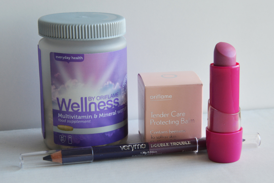 Wellness Multivitamin & Mineral vitamiinitabletteja, Tender Care Protecting Balm voide, VeryMe Double Trouble kaksipäinen silmienrajaus kynä sävyssä Electric Purple ja huulipuna sävyssö Violet Vibe.