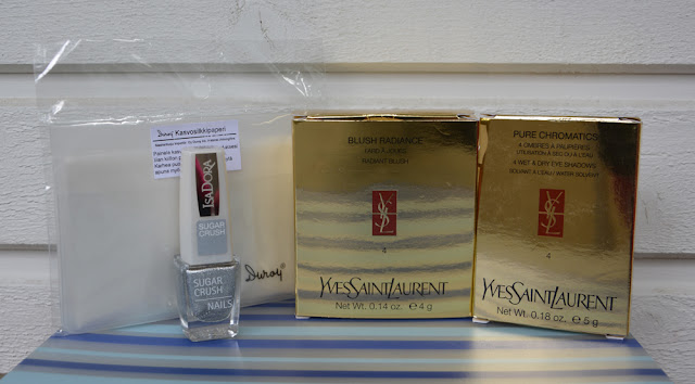 Kävin tosiaan Sokoksella hieman ostoksilla ja löysinkin alesta kivoja löytöjä. Ostin YSL:n poskipunan, sekä luomiväripaletin. Lisäksi normihintaan ostin Duroyn kasvosilkkipaperia sekä Isa Doran tekstuurikynsilakkaa.