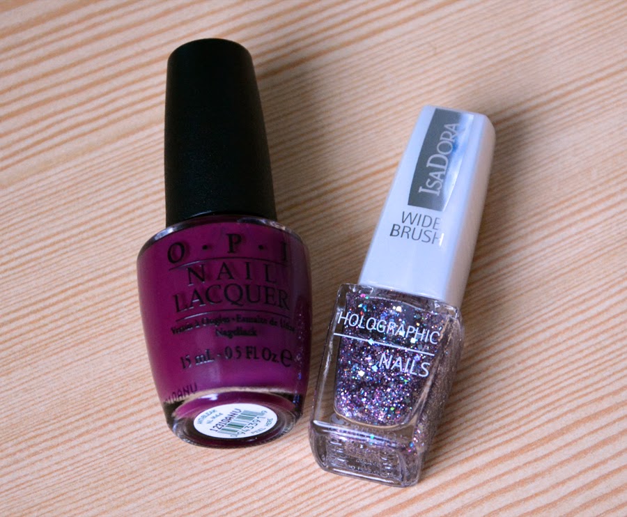 Laitoinkin siis ensin pohjalle yhden kerroksen OPIa ja sitten päälle kerroksen IsaDoran Holographic lakkaa. Hetken aikaa mietin laittaisinko vielä toisen kerroksen Holographicia ja päädyin sitten vielä laittamaan. En tiedä oliko sillä kovinkaan suurta merkitystä, mutta onpahan enemmän glitteriä! Ja tässä lopputulos: