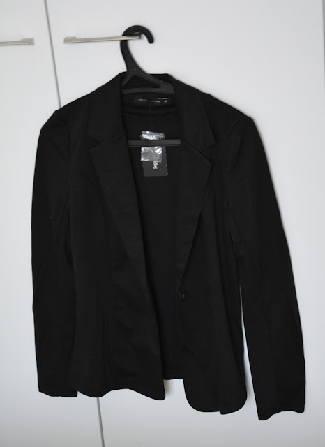 Musta trikoo/kangasjakku. Arkikäyttöön juuri sopiva, eli ei liian juhlava. Seppälästä ja normihinta 29,95, mutta tästäkin oli -40%.