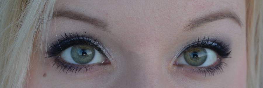 Koska en ollut puuteroinut luomea ennen luomivärin laittoa, ei häivytyskään ollut ihan yksinkertaista. Pistin siis puuteria värin ylärajaan hieman ennen häivytystä ja käytin häivytyksessä apuna myös tuota valkoista väriä. Häivytystä voi tosiaan helpottaa helmiäisvalkoisella, jos luomiväri tuppaa jämähtämään kovastikin luomeen. Alarajauksen tein samalla violetilla, mitä käytin luomellekin.