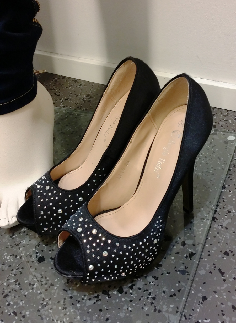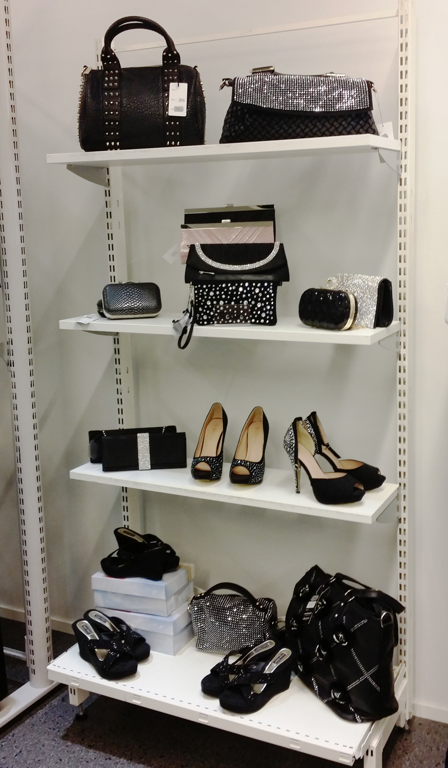 Tässä yksi mun suosikkihylly. Juhlalaukkuja, kenkiä ja niin paljon blingiä! Tuotteiden hintaluokka on mielestäni aika keskitasoa. Ei yllä halpis-ketjuliikkeiden hintatasoon, vaan on hieman sitä korkeampi, mutta eivät nämä mene kyllä mihinkään hirmu kalliinkaan puolelle. Esimerkiksi farkut on pääasiassa 69€ ja useimmat neuleet 39€.