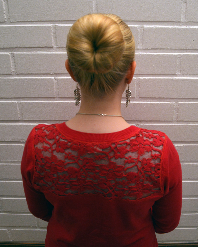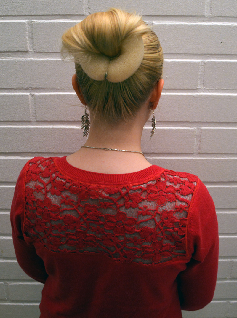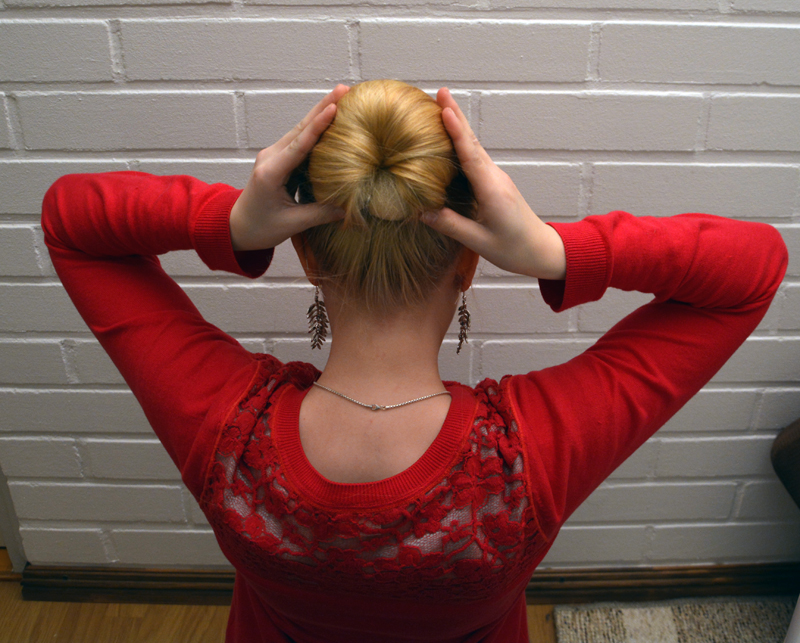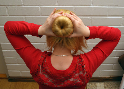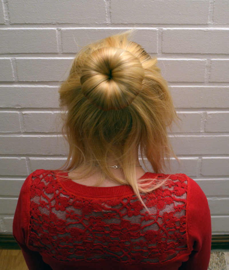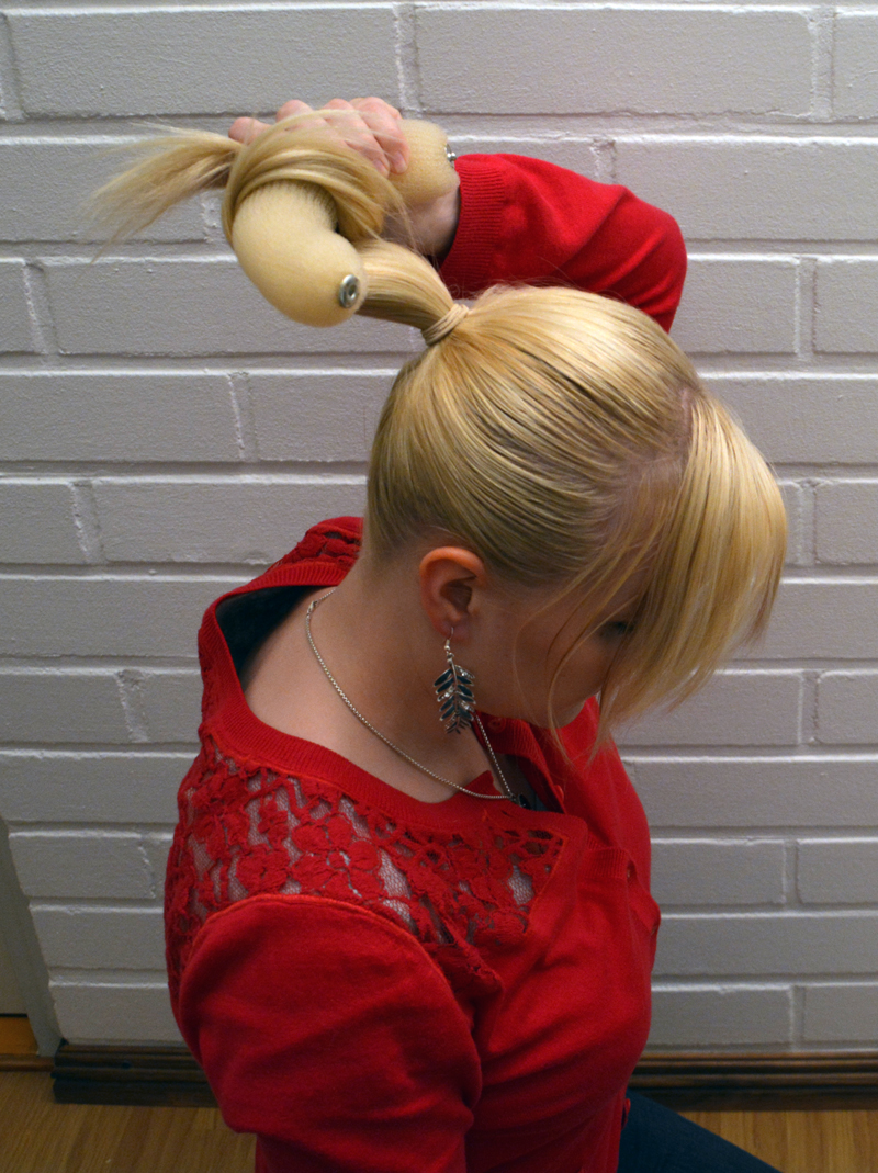 Lähde kierittämään hiuksia latvoista valkin ympärille. Valkki on siis tässä vaiheessa avattu pötköksi. Hiukset saa kierittää aika tiukasti ja latvat kannattaa yrittää työntää alimmaiseksi etteivät ne sitten lähde töröttämään nutturasta.