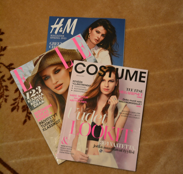 Minulle tulee kaksi muotilehteä tällä hetkellä. Elle ja Costume. Ellen tilaus loppuneekin tässä pian ja Costumen tilauksen juuri aloitin. Tykkään katsella lehdistä muodin uusia tuulia ja saada ideoita siitä, mitä vaatekappaleita itsekin hankkisin. Lisäksi lehdistä saa inspiraatioita uusiin meikkeihin ja meikkituotteisiin. Harmillisen usein vain kun lehdestä löytää jonkun kivan vaatekappaleen, sen hinta on monesti kolminumeroinen, joten sellaisiin minulla ei ole varaa. 🙂