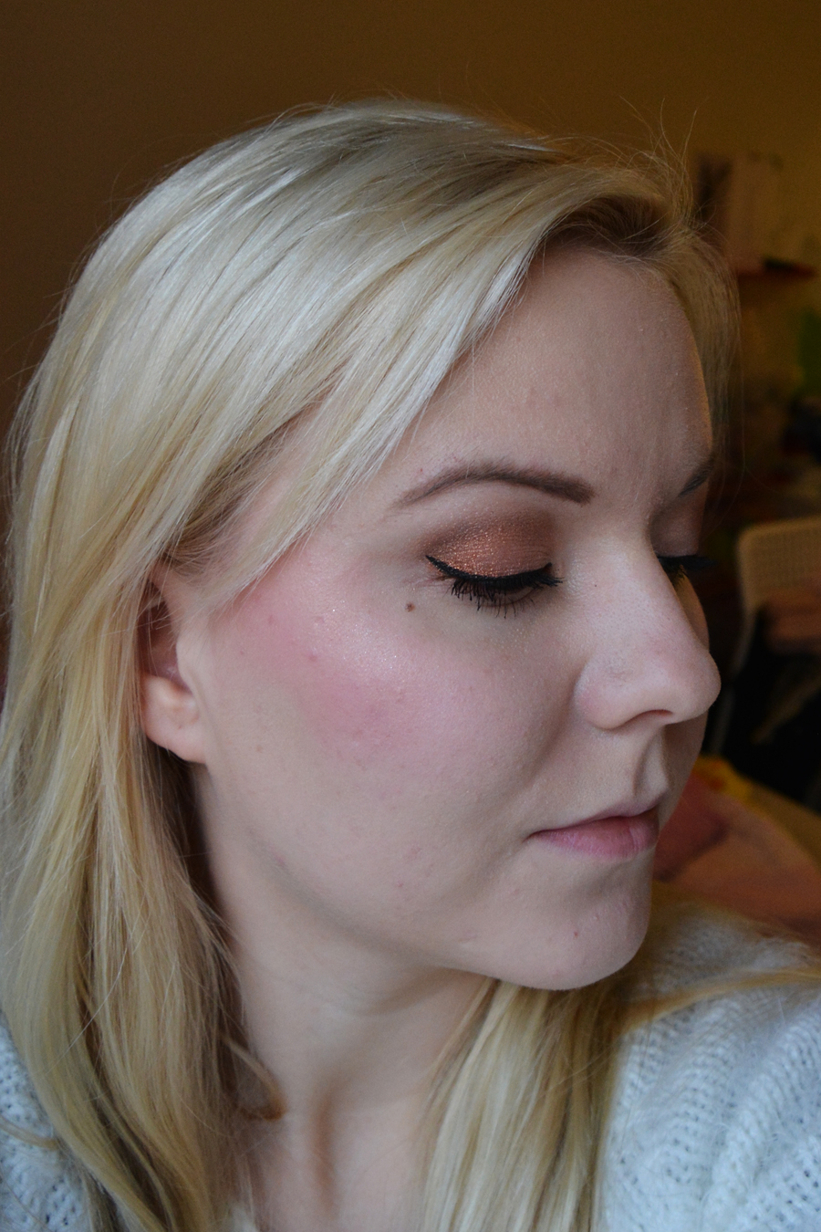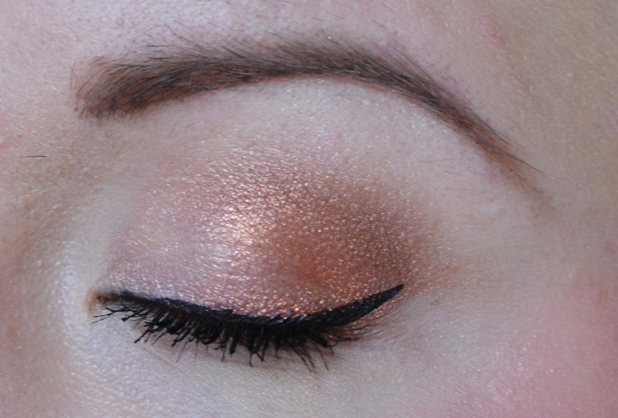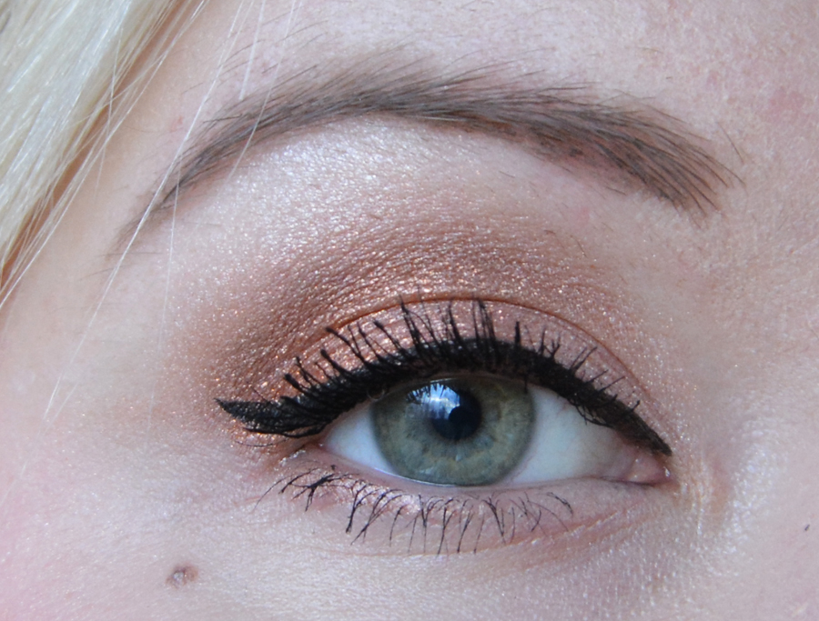 Tykkään yhdistää tuon Zuiin poskipunan nimenomaan kullanvivahteiseen meikkiin, joten tässä olen yhdistänyt sen messuilta ostamaani Inglotin Eye shadow pigment sävyyn 63. Alla vielä vähän tarkempaa kuvaa silmämeikistä.